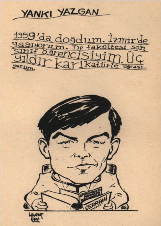 Tıp fakültesi öğrencisiyken mizah merakımın nasıl canlandığını hatırlamaya çalışıyorum. Lisede yayımlanmamış okul yıllığının çizgilerini yaptığıma bakarsak, espri yapabiliyor, çizgi çizebiliyordum. Davis’in 3’üncü koşulu benim için ne zaman gerçekleşti? Tıp fakültesinde kendimden (başka beceri geliştirebileceğimden) umudu kesmiş miydim ki, karikatür hayatımı canlandırmaya karar verdim. Yandaki çizgide (bir başka doktorluktan umudunu kesmiş arkadaşım Dr Levent Efe’nin çizgisiyle) 1981’de resmedilmiş halime baktığımda, cerrahi staj notlarının arasındaki epistemoloji kitabıyla kendisi mizahi olan bir doktor adayı gibi gözüküyorum.